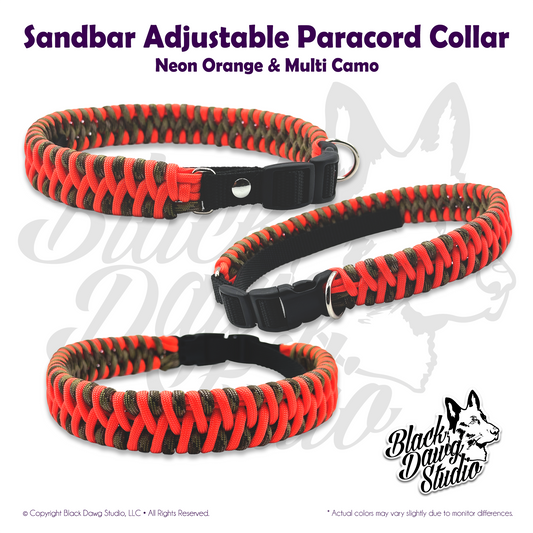 Sandbar Design Adjustable Paracord Dog Collar | Neon Orange & Multi Camo