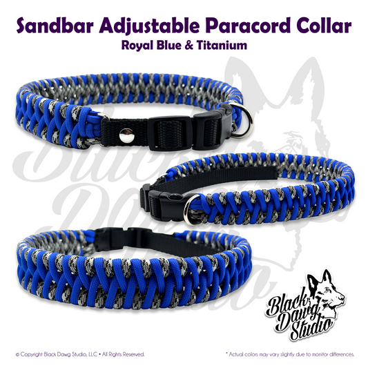 Sandbar Design Adjustable Paracord Dog Collar | Royal Blue & Titanium