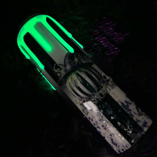 RTS 30oz Skinny Straight Tumbler Reverse Ombré Black & White | It’s Showtime Pumpkin decal | Glow in the Dark 3D Drip