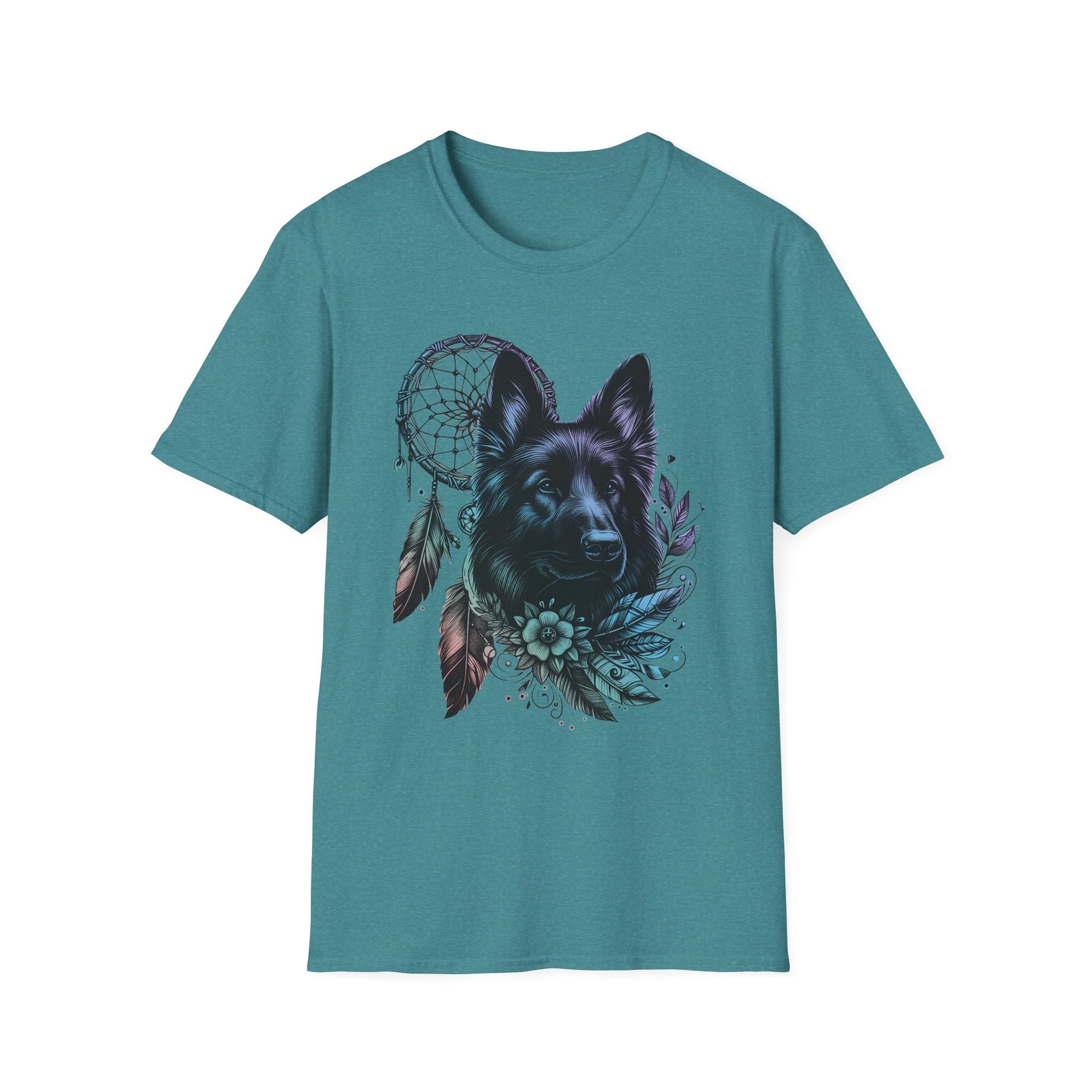 This German Shepherd Dog Dreamcatcher Boho T-shirt offers a bohemian vibe, perfect for dog lovers and fans of unique designs. It is relevant for casual wear, pet lovers, dog enthusiasts, and boho style enthusiasts. Ideal for gifting on birthdays, holidays, and special occasions.